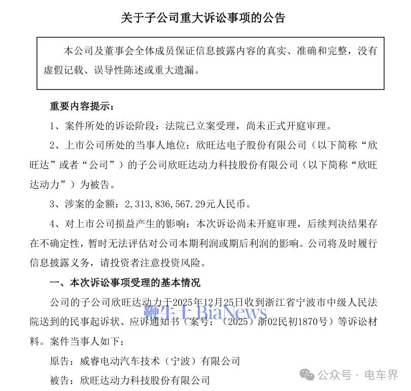 根据欣旺达昨天发布的公告,欣旺达旗下子公司欣旺达动力已于12月25日收到浙江省宁波市中级人民法院送达的法律文书,包括一份民事起诉状。