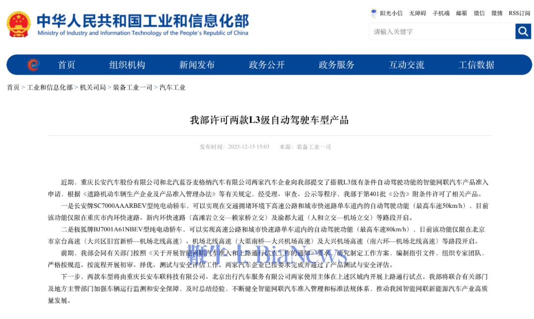 先是北汽新能源和长安汽车,这两家搭载 L3 级有条件自动驾驶功能的智能网联汽车产品,已正式获得工信部准入许可。