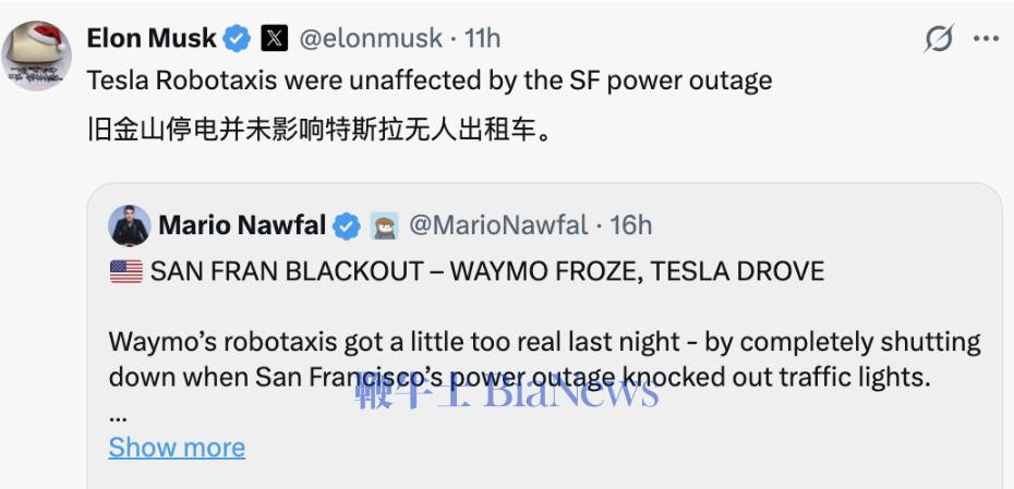 马斯克也直接补刀,称:特斯拉的 Robotaxi,在这次停电中,完全未受影响。