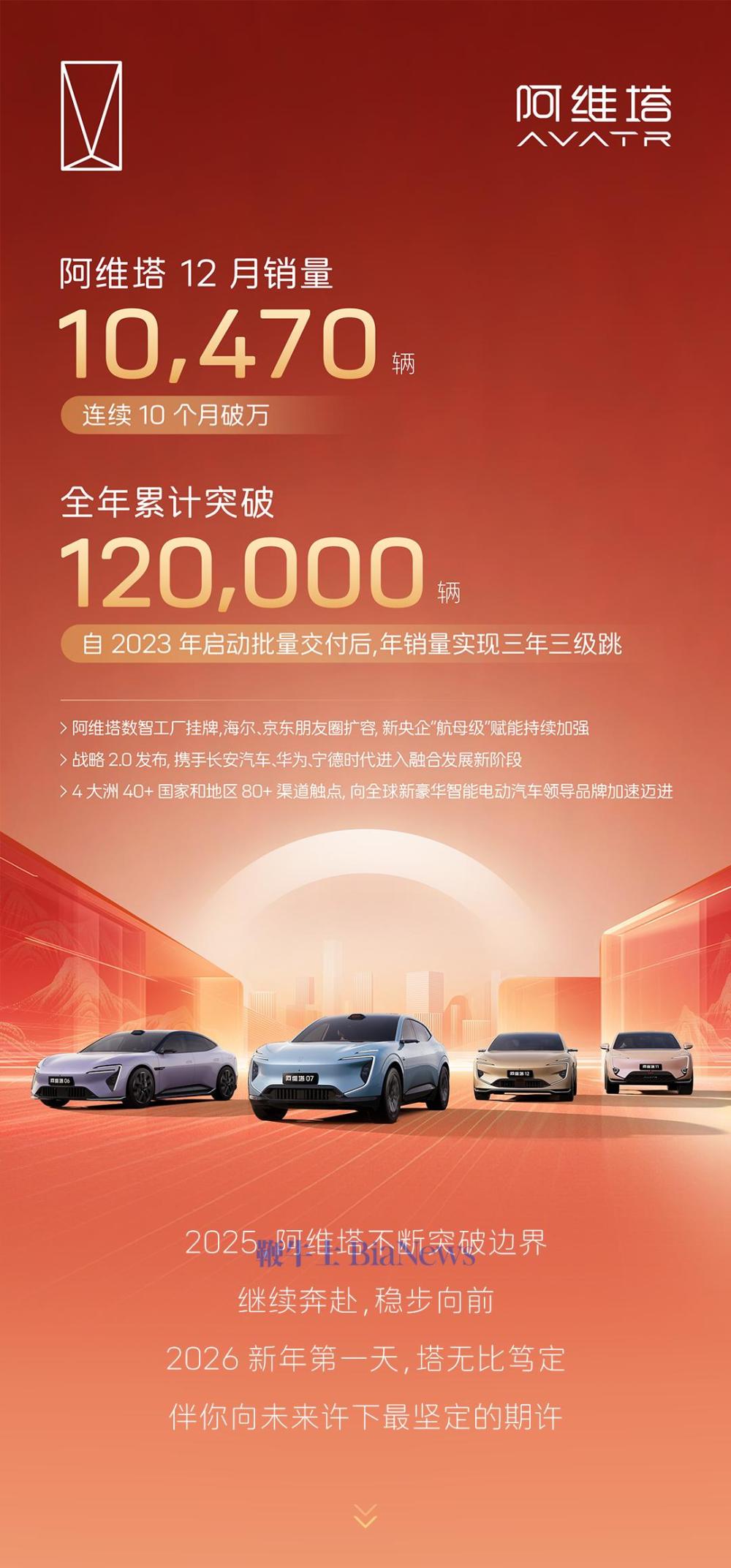 1月1日,阿维塔公布2025年12月销量10470辆,连续10个月销量破万。全年累计销量突破12万辆。