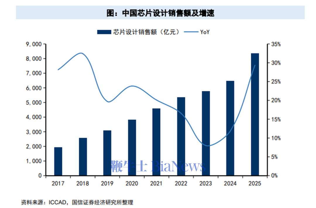 数据显示,2017-2025年我国芯片设计企业数量和销售额均以两位数复合增速增长。中国芯片设计企业数量由2017年的1380家增长至2025年的3901家,年均复合增速为14%,其中销售额过亿的企业数量由2017年的191家增长至2025年的831家,年均复合增速20%。从销售额来看,2017年为1946亿元,2024年增至6460亿元,年均复合增速19%,高于全球半导体销售额同期6%的增速。