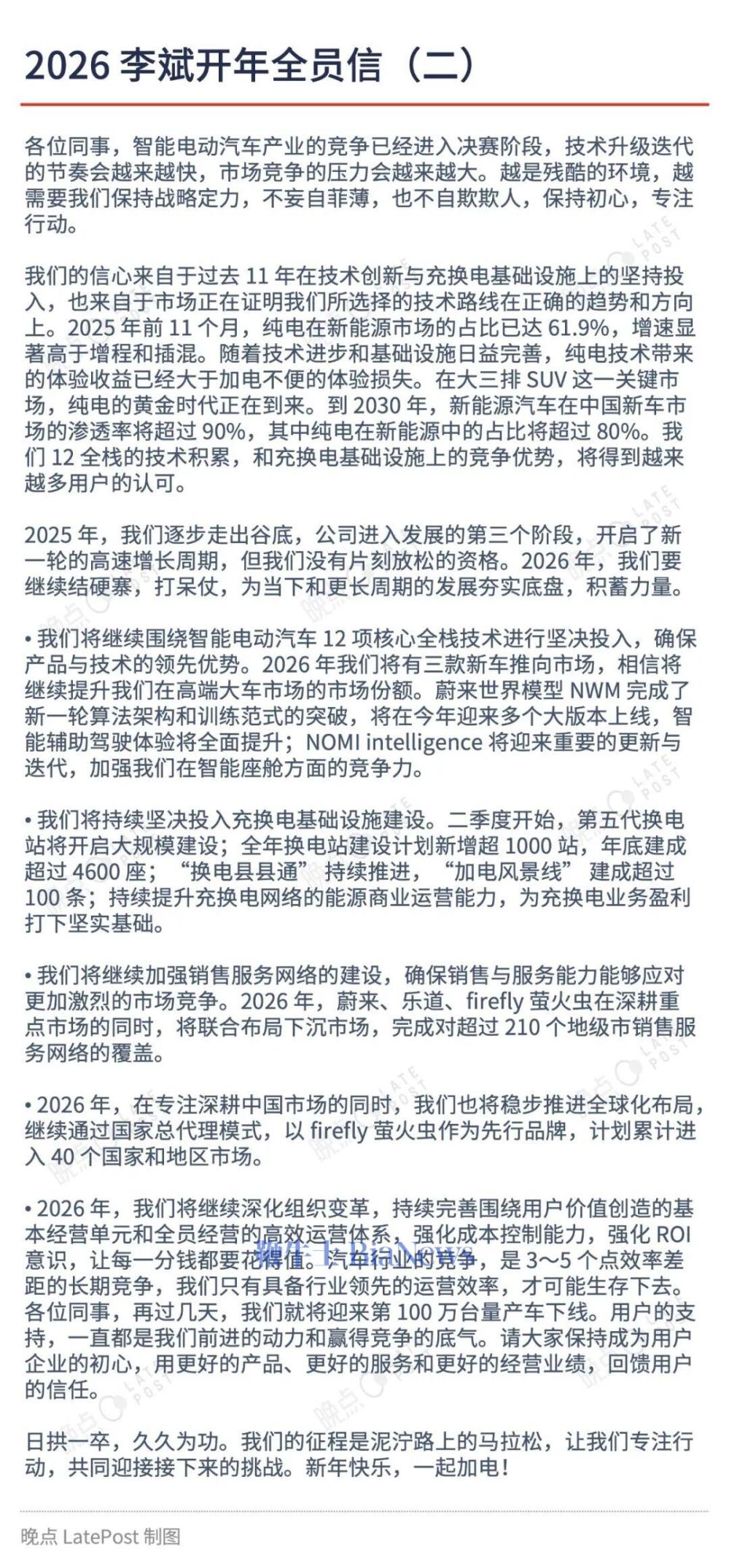 2026 年 1 月 1 日晚间,刚刚结束了滇藏换电贯通直播的蔚来创始人、董事长、CEO 李斌发布了一封全员邮件。