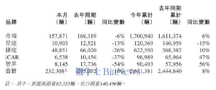 电车界此前消息,奇瑞集团五大品牌12月合计销量232,308辆,较去年同期的275,052辆减少16%。