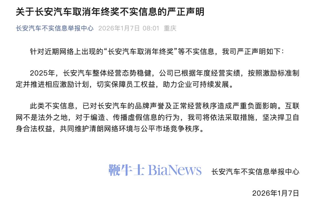 长安汽车回应网传「取消年终奖」:不实信息