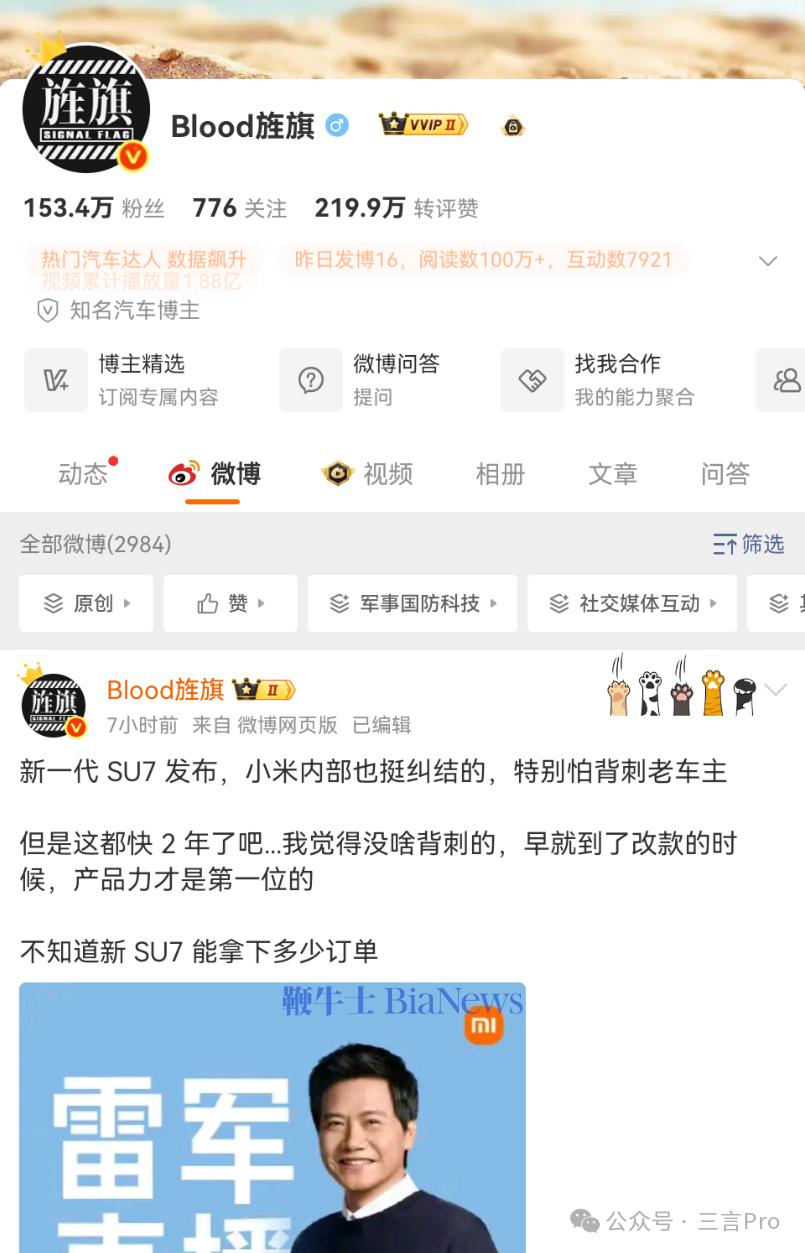 而“草数码(Blood旌旗)”微博账号也没有显示被封禁或者禁言,同时最新动态发布于7小时前;不过该博主开启了“一键防护”模式,无法被搜索到也无法关注。