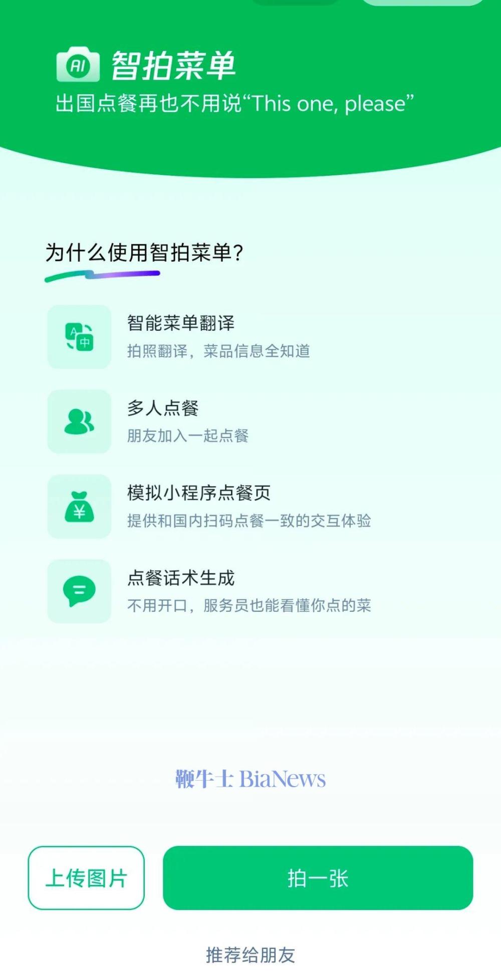 腾讯推出了一款“智拍菜单”小程序,聚焦出国点餐场景的语言与操作痛点。核心功能涵盖智能菜单翻译、多人点餐、模拟国内扫码点餐交互体验,还能生成点餐话术。
