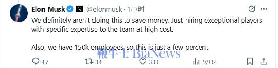 马斯克回应称:“我们这样做绝不是为了省钱。而是为了聘请那些具备专业技能的杰出人才加入我们的团队,而且是以高成本。此外,我们有15万名员工,所以这只是百分之几。”