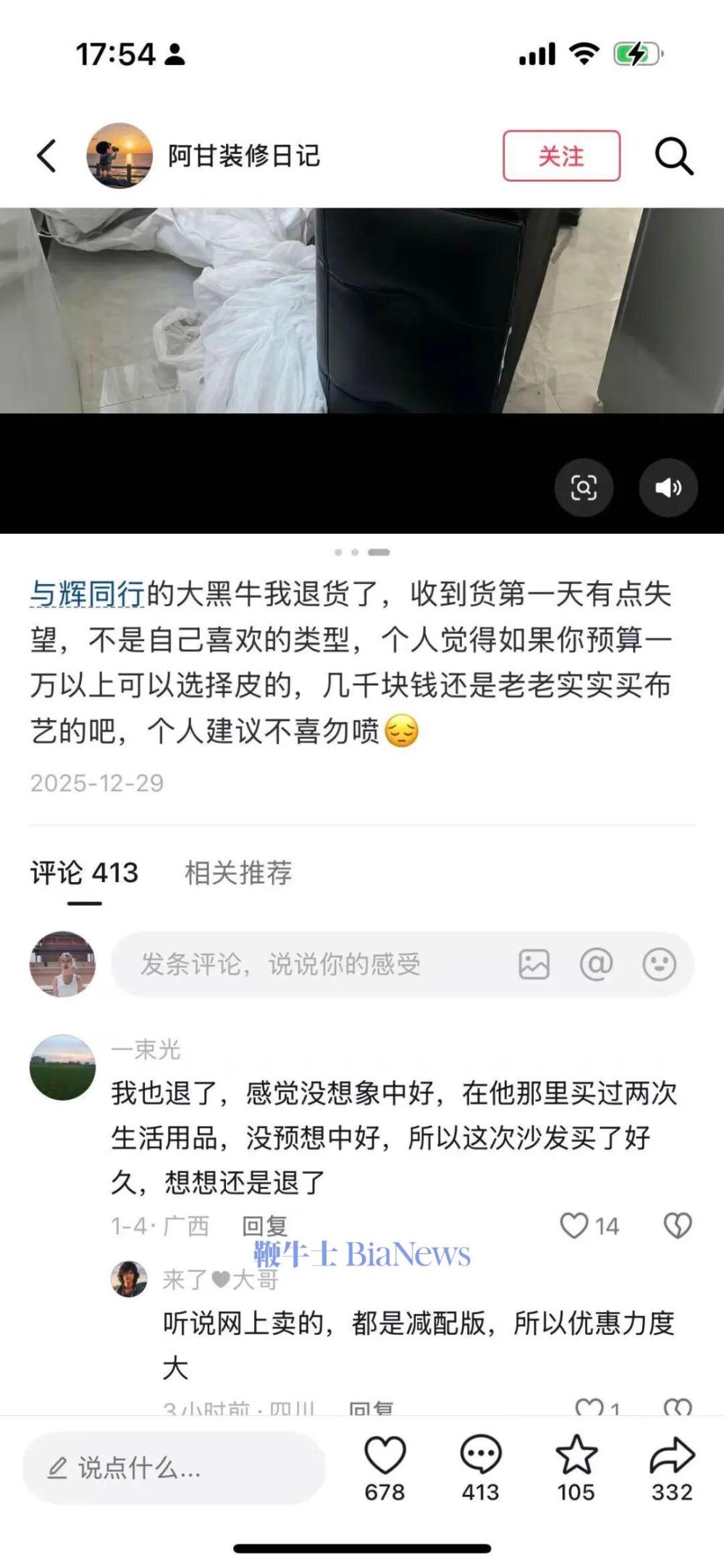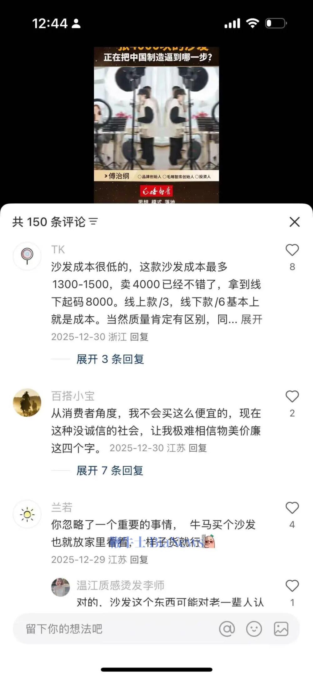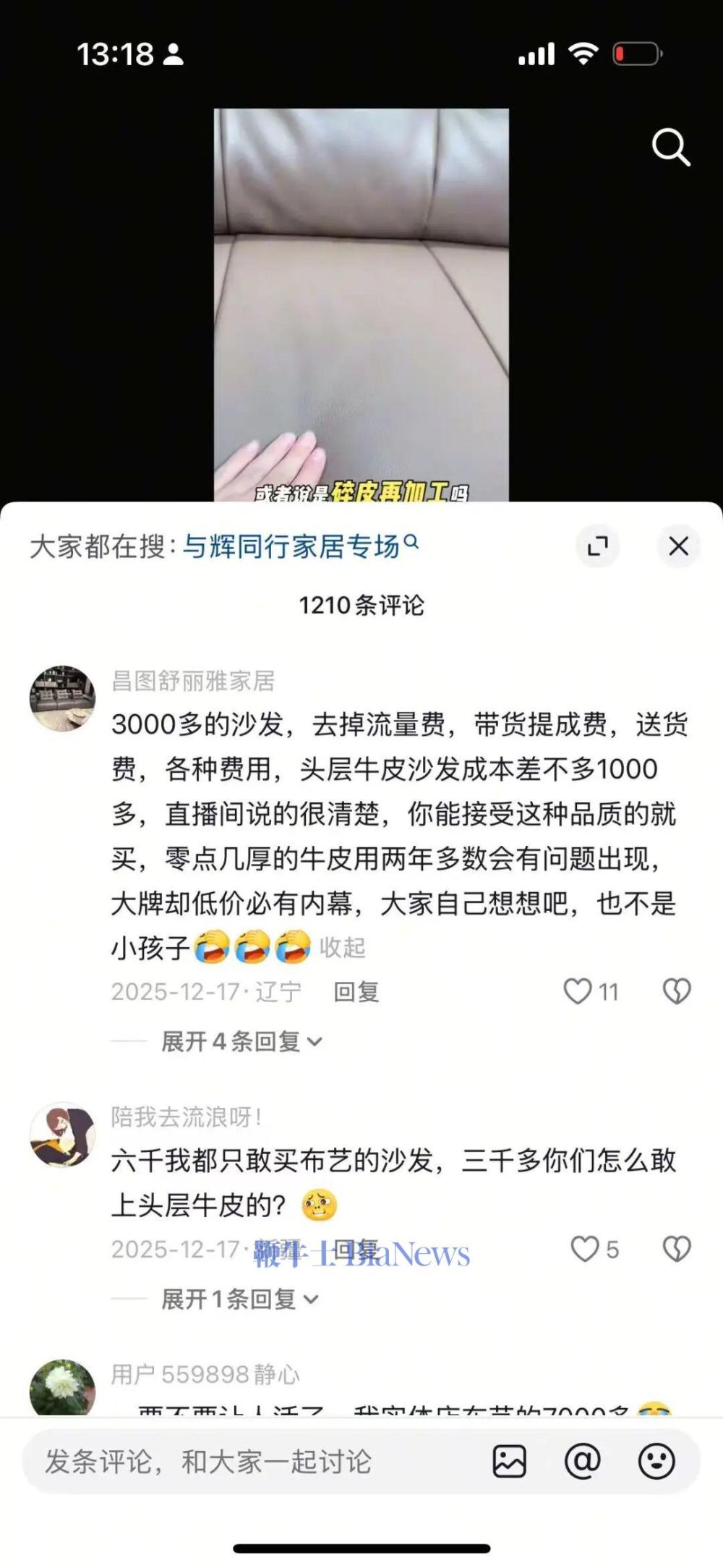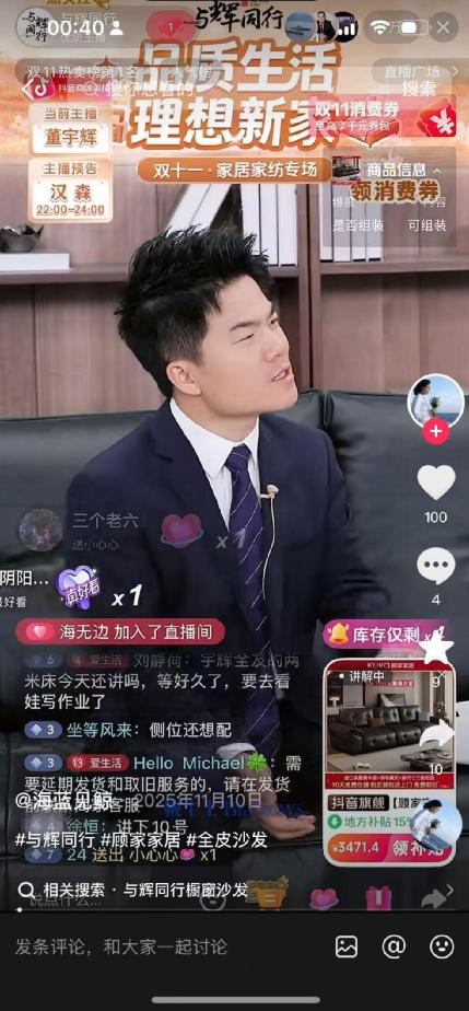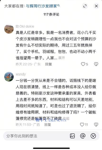 尽管直播中,董宇辉已多次强调该款沙发为直播间定制款,是“接触面真皮”而非全皮,但“赔本赚吆喝”“顾家找代工”等声音仍甚嚣尘上,不乏经销商和行业从业者放话,“大牌低价必有内幕”。