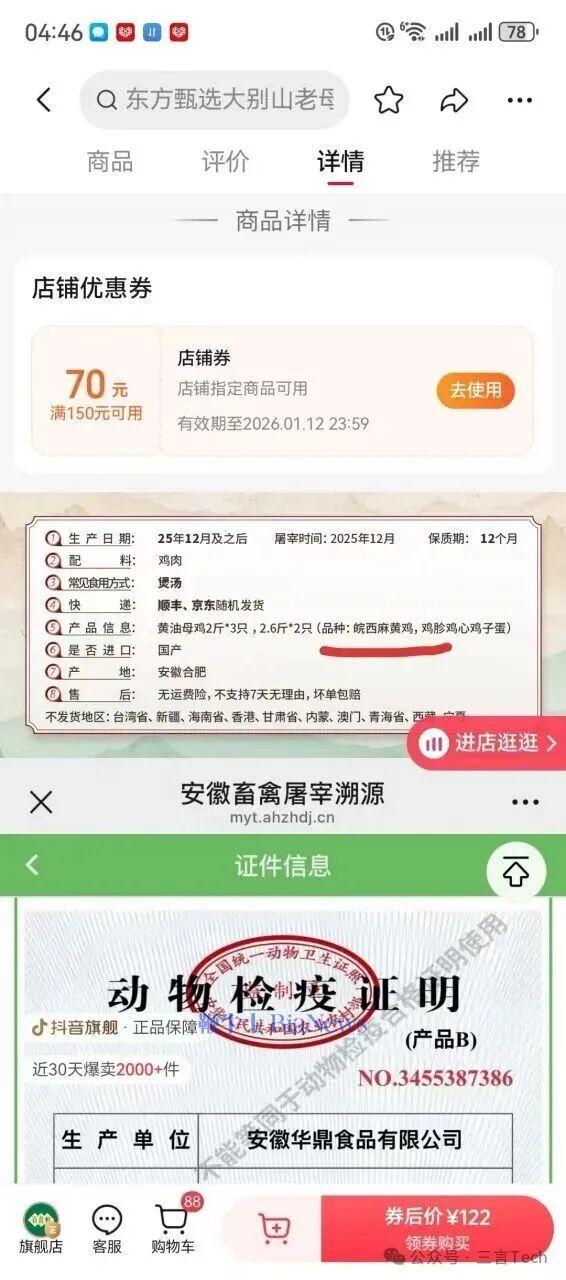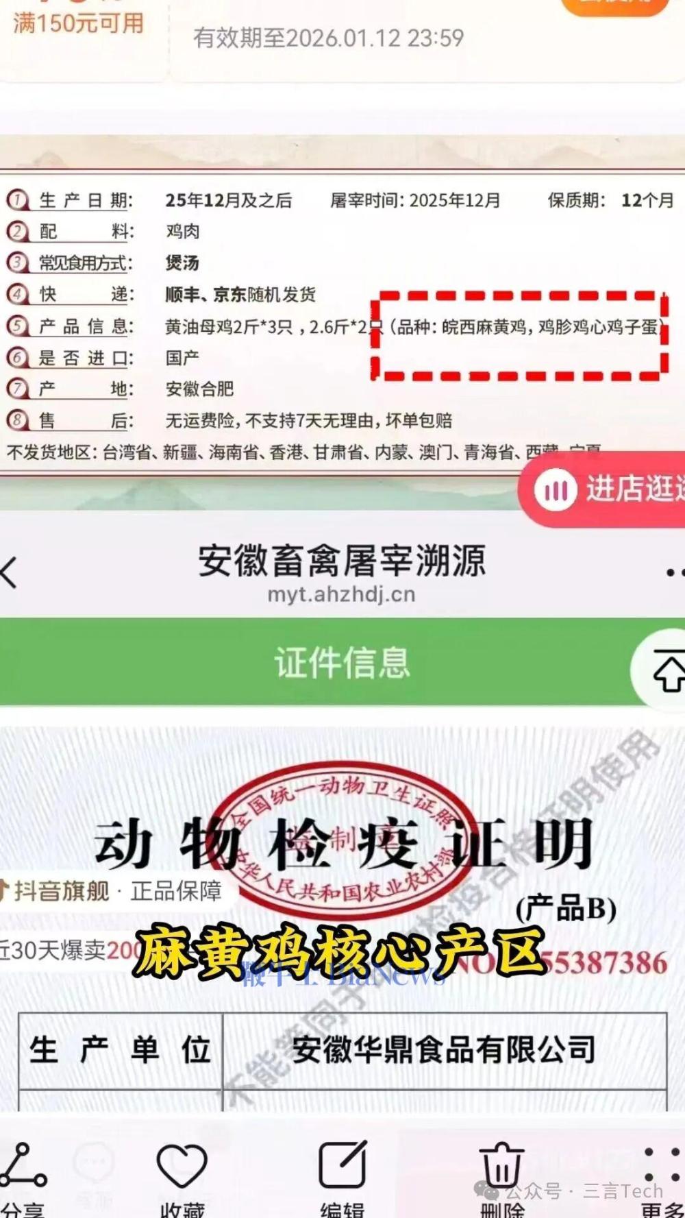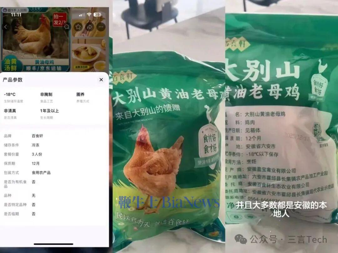 近日,一个名为“会长谈鸡”的视频号,发布一条视频称,与辉同行直播间带货的一款“大别山黄油母鸡”存在虚假宣传问题,此事引发关注。该视频称,经查,与辉同行带货的“百食轩83.8元三只大别山黄油母鸡”存在两大关键问题。首先,厂家在产品标准中宣称的品种为皖西麻黄鸡,然而这一品种并不存在,属于虚构,扰乱了市场秩序。其次,协会通过公开渠道采购该产品后对比发现,其与皖西地区麻黄鸡特有的“三青”(青喙、青腿、青爪)外在特征严重不符。此外,该视频还展示了一则落款为“六安市麻黄鸡产业协会”发布于1月9日的声明。