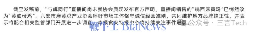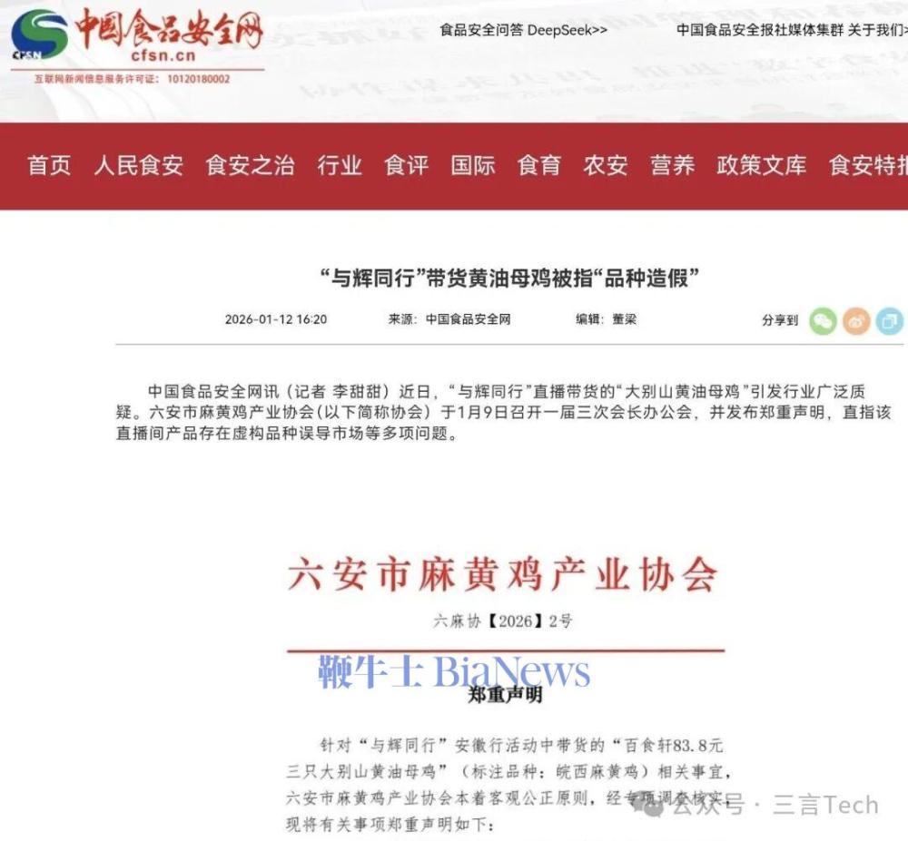 发布上述视频的博主“会长谈鸡”个人简介称自己是“六安市麻黄鸡产业协会会长,安徽省饲料标准化委员会委员”。该视频发布后,随即引发大量网友讨论,有网友认为与辉同行应该“假一赔三”,但也有大量网友认为此事纯粹是“碰瓷”,蹭流量。随后,“会长谈鸡”视频号又发布一条视频称,在这条视频里,该博主晒出了涉事产品电商平台的简介信息。信息显示为“黄油母鸡2斤*3只,2.6斤*2只(品种:皖西麻黄鸡,鸡胗鸡心鸡子蛋)”。“会长谈鸡”表示,首先,六安地区是皖西麻黄鸡的核心产区,但协会在核心产区未发现相关带货鸡的采购和交易记录,呼吁相关方提供采购记录以正视听。其次,按照市场价格,83.8元仅能购买到半只正宗皖西麻黄鸡,不可能买到三只。最后,超过500天的皖西麻黄鸡数量极少,一年不足两万只,无法满足电商大规模带货需求,产量稀少。关于此事争议点在于与辉同行直播间带货的该产品到底是不是选用了“皖西麻黄鸡”?很多认为与辉同行是被“黑”了的网友晒出了自己购买涉事品牌鸡的外包装以及相关信息照片。照片显示这款鸡名称为“大别山黄油老母鸡”,而在产品详细信息以及线上平台介绍中,均未标注是“皖西麻黄鸡”。对此,笔者咨询涉事品牌方“百食轩”客服和与辉同行直播间客服。百食轩客服表示,与与辉同行合作售卖的“83.8元3只黄油老母鸡”品种是“黄油老母鸡”,并非“皖西麻黄鸡”。而与辉同行直播间客服则仅仅表示已经记录情况,并未直接回复。此外,笔者发现,目前与辉同行账号橱窗中,无法搜索到百食轩品牌的任何产品;同时,百食轩在各电商平台旗舰店中售卖的产品中,目前已经没有在产品细节里提及鸡品种为“皖西麻黄鸡”。另一方面,还有很多网友质疑六安市麻黄鸡产业协会发布的所谓“郑重声明”是伪造。主要原因是这份声明落款的公章看上去“奇怪”。该印章上半部分在字体下一层,但是下半部分却覆盖了落款名称,并且能看出印章抠图不完整。不过,安徽省六安市农业农村局曾于2023年10月23日发布过一则消息,宣布六安市麻黄鸡产业协会成立。该文称,2023年10月21日,由安徽省百草香食品加工有限公司等九家麻黄鸡产业企业共同发起,成立六安市麻黄鸡产业协会,并召开一届一次会员大会。因此,确实存在这个协会,不过协会似乎是几家企业发起。至此,此事看上去似乎与辉同行确实遭到“碰瓷”,但中国食品安全网一篇报道又给事件带来了未知变数。1月12日,中国食品安全网发布一篇文章,援引了六安市麻黄鸡产业协会发表的上述声明。文章中晒出了百食轩电商旗舰店里相关产品介绍的完整截图,截图中确有“皖西麻黄鸡”的品种描述。此外,中国食品安全网发表的这篇文章末尾,还提到目前与辉同行直播间售卖的涉事产品已经更名为“黄油母鸡”。那么,与辉同行是否真的存在虚构品种问题,还需要等待进一步了解。(转载自三言Tech)