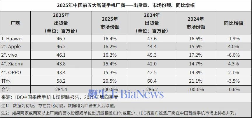 苹果与vivo出货量分别为4620万台和4610万台,以16.2%的市场份额并列第二;
