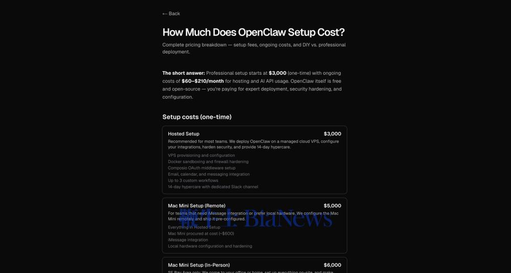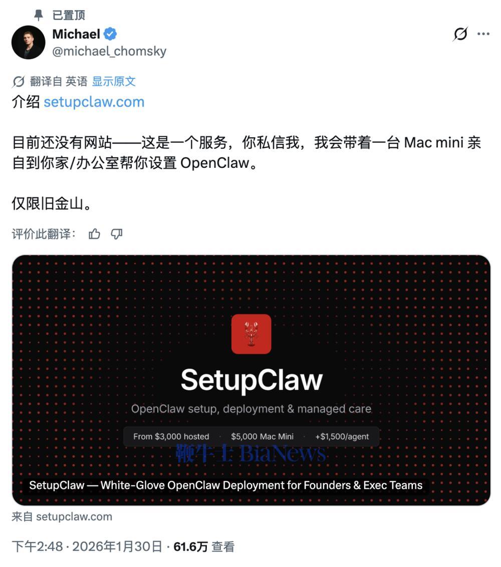 海外代装平台SetupClaw已经给出明码标价:托管安装,3000美元;含Mac mini硬件的远程配置,5000美元;含Mac mini硬件的现场配置,6000美元。