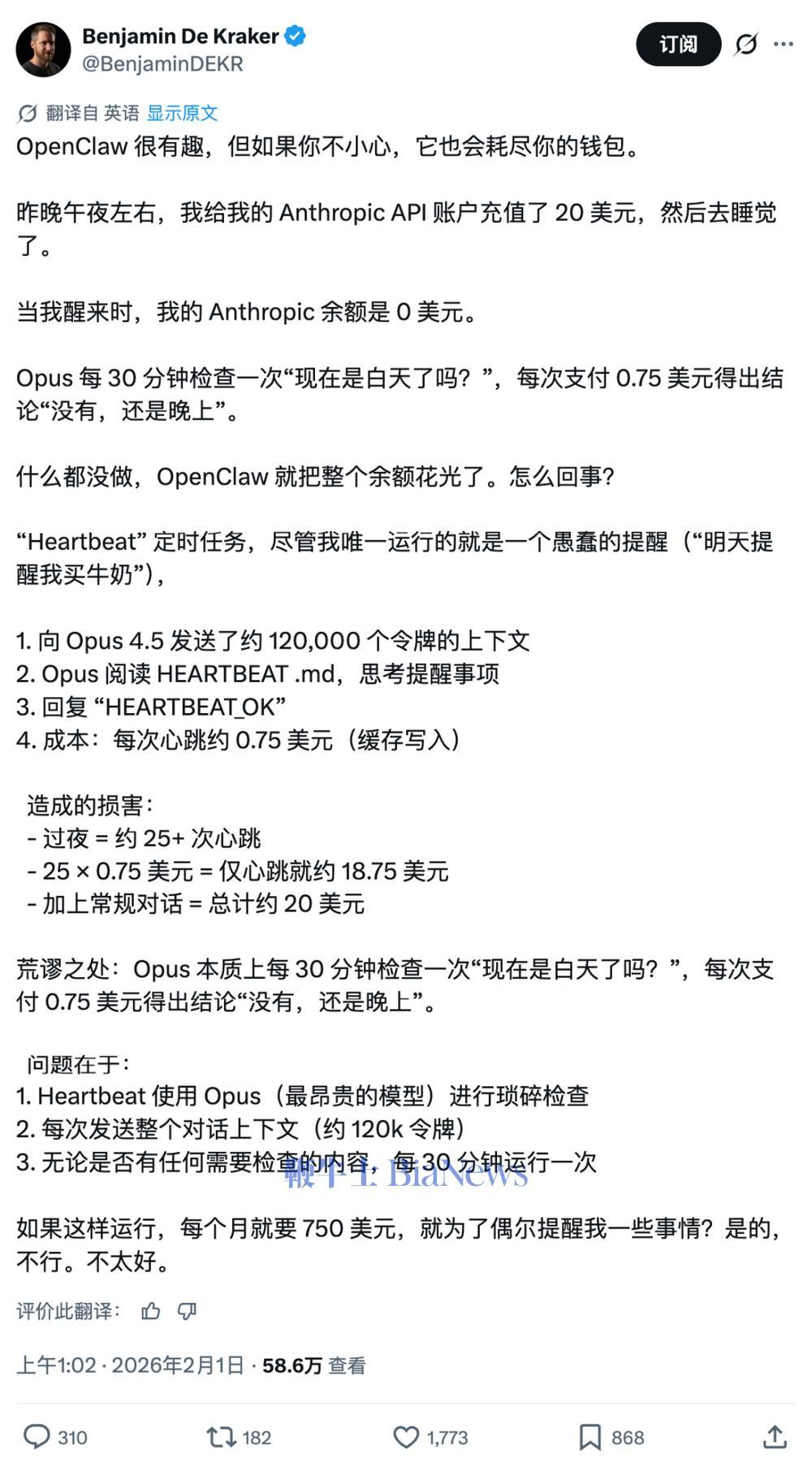 有开发者复盘后发现,系统在没有太多实际产出的状态下,仅靠心跳机制维持每天就消耗20美元,一个月白白烧掉近750美元。