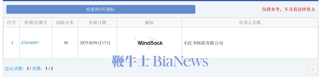 此外《读佳》还发现,开若图科技(上海)有限公司另外一款产品MindBack,其界面左上方的logo,与小红书科技有限公司在2025年9月17日申请的一个商标在名称与logo的文字、图形组合、整体布局高度相似。