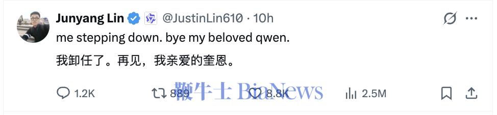 报道也再度证实,林俊旸在 X 平台上的告别帖非常简单,且阿里官方对此拒绝评论。