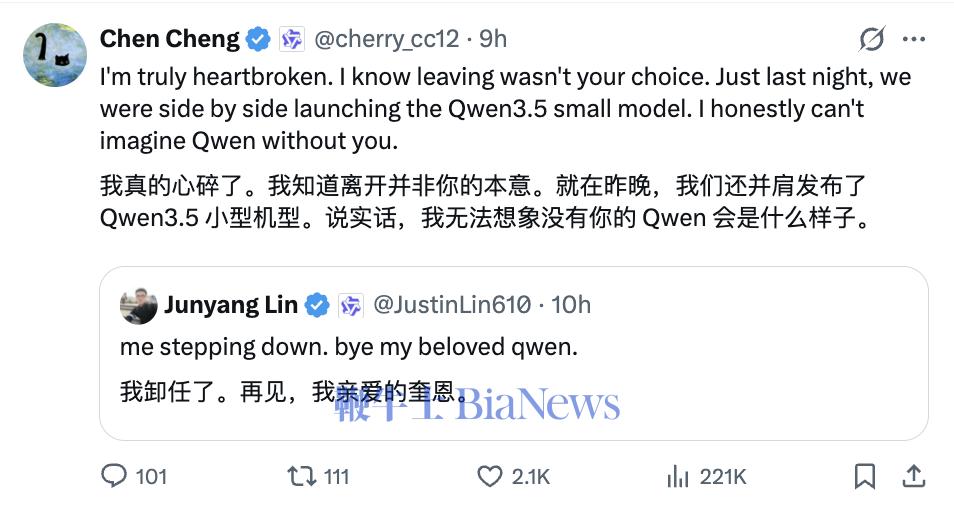 Qwen 成员 Chen Cheng 在转发时写道:"我真的心碎了。我知道离开并非你的选择。就在昨晚,我们还并肩发布 Qwen3.5。说实话,我无法想象没有你的 Qwen。"