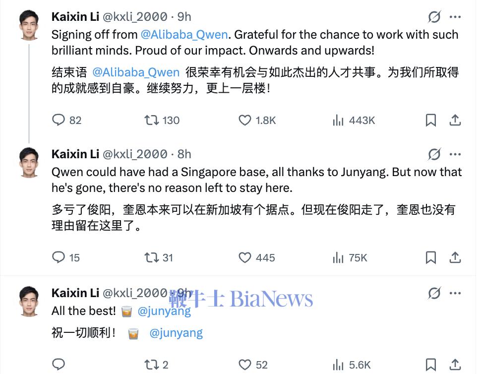 ● Kaixin Li,Qwen3.5、Qwen-VL、Qwen-Coder 核心贡献者,在 X 上宣布离队;