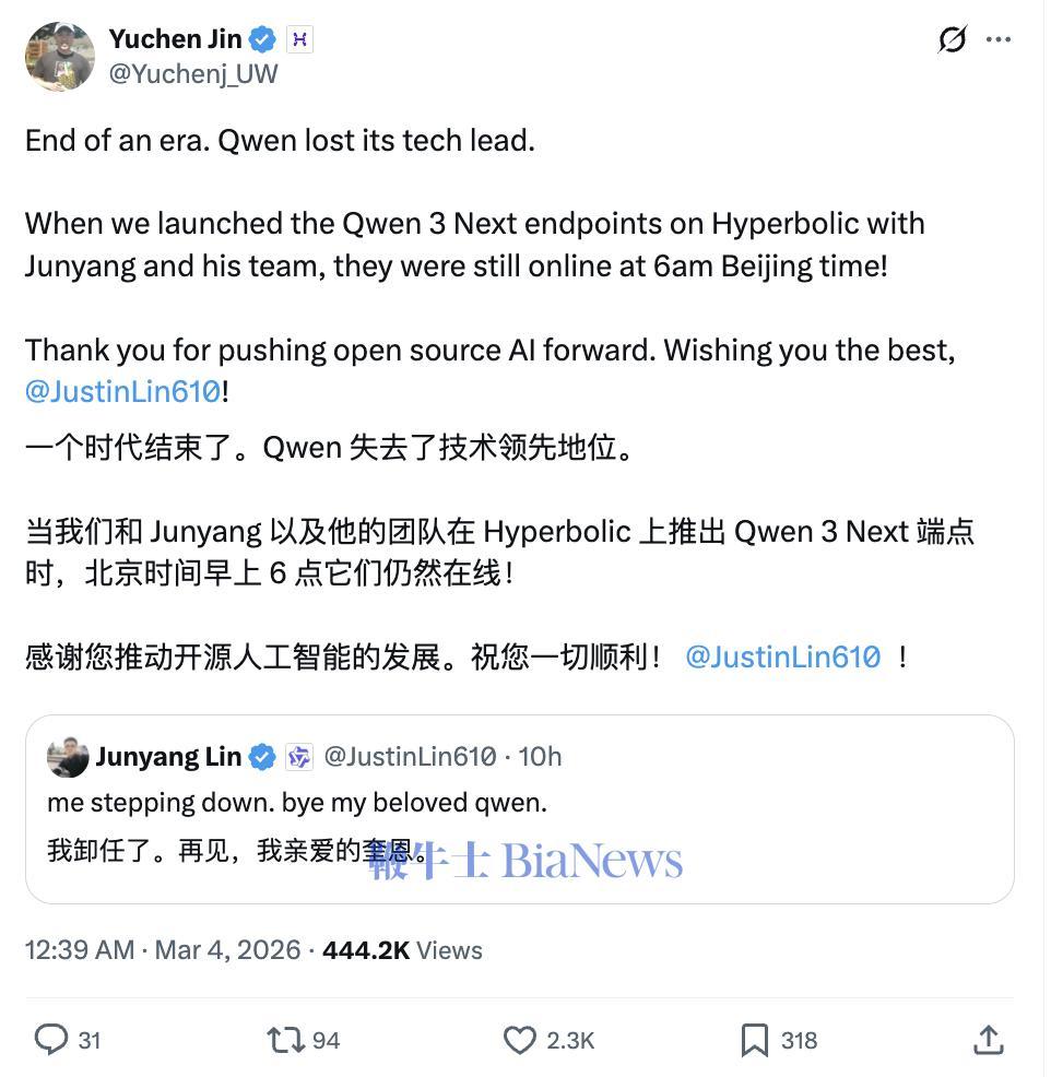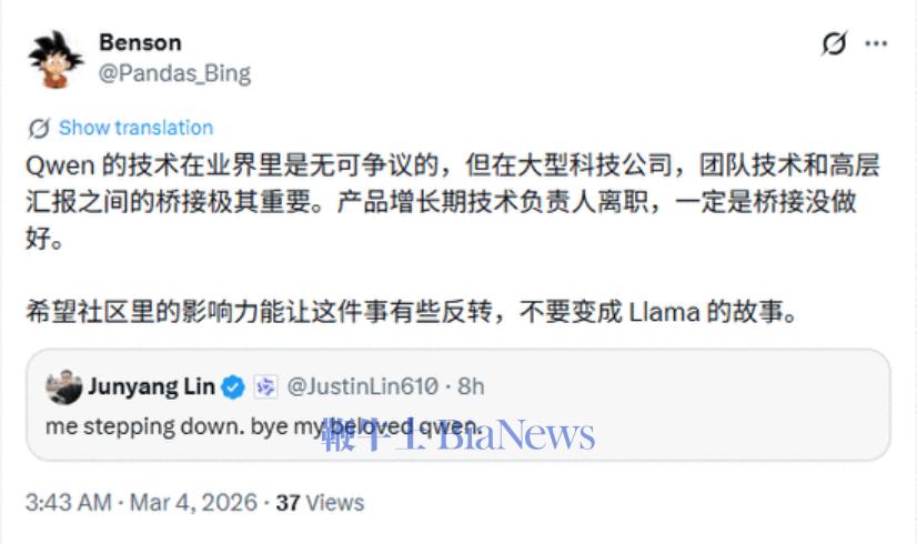 3 月 4 日凌晨,X 上这些评论在几小时内密集刷屏。起因只是一条九个单词的推文: "me stepping down. bye my beloved qwen."