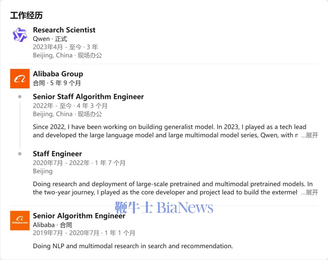 2019 年,他以应届生身份加入阿里达摩院智能计算实验室,参与 M6 多模态模型研发;2022 年,主导 OFA 与 Chinese CLIP,同年接棒千问技术负责人;2025 年,32 岁晋升为阿里史上最年轻 P10 技术专家。