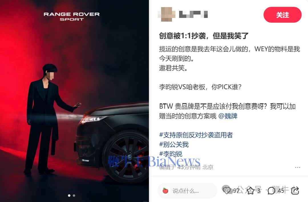 今日,长城汽车旗下魏牌宣布,长城汽车董事长魏建军成为魏牌V9X代言人。就在大家纷纷感慨魏老为公司大老板,亲自上阵为自家产品代言时,有网友在社交网络平台发文称,魏牌V9X的广告设计抄袭了自己为路虎揽运做的创意。该网友明确表示,“揽运的创意是我去年这会儿做的,WEY的物料是我今天刷到的。邀君共笑。”并且,网友公开喊话魏牌,“贵品牌是不是应该付我创意费呀?我可以加赠当时的创意方案哦 。”从网友晒出的对比图来看,二者同为暗红背景底色,代言人的站位、姿势也极为相似。并且,车辆摆放位置也均为画面右侧,车灯同为打开状态。大体来看,确实极为相似。不同的是,画面中,魏建军的手掌已经触碰到了车身,而揽运代言人的手并未与车身有直接接触。对此有网友调侃道,“不能说是毫不相干,简直是一模一样。”截至发稿,官方尚未就此事进行回应。大家觉得,魏牌这次是否构成抄袭?