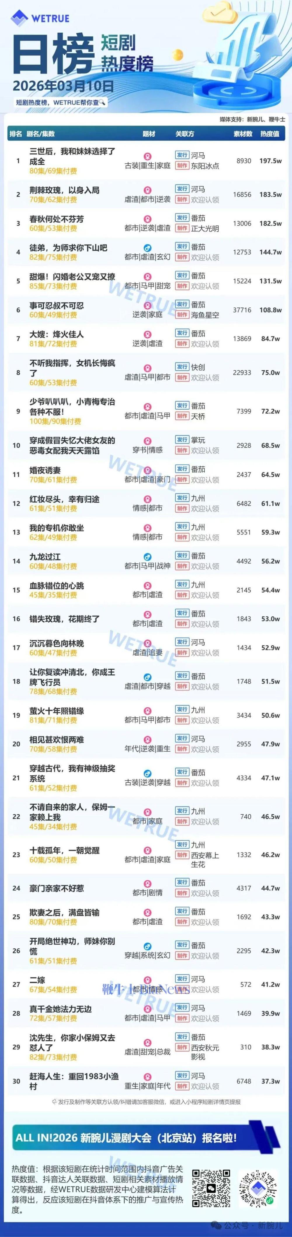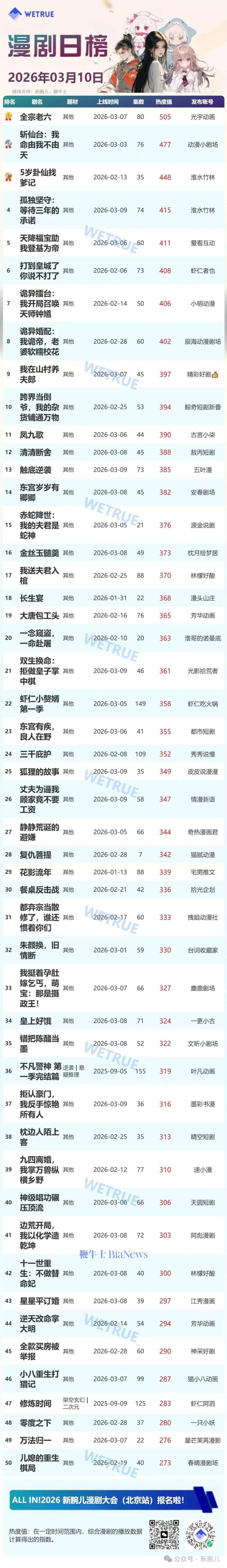 今天发布的是昨天(3月10日)漫剧及短剧付费大盘日榜。