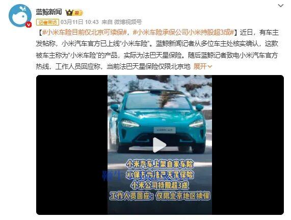 有小米车主发帖爆料,在车辆续保时,小米汽车官方渠道悄然推出车险服务,凭借低价、多服务的卖点,瞬间点燃市场热议。大家纷纷感慨,雷军又要把车险价格打下来了,这对饱受高价车险困扰的车主来说,无疑是个重磅利好。但热闹背后,真相需要厘清。这款被车主口口相传的“小米车险”,并非小米自营保险产品,而是北京法巴天星财产保险股份有限公司推出的车险业务。这场看似跨界卖保险的操作,本质是小米深度布局汽车产业链、切入出行服务的关键一步。天眼查数据显示,法巴天星保险成立于2025年12月16日,注册资本10亿元,是一家刚起步的新险企。股权分配上,法国巴黎保险集团持股49%,四川银米科技持股33%,大众汽车金融服务海外股份公司持股18%。其中四川银米科技,由北京小米电子软件技术有限公司全资控股,而雷军个人持有小米电子软件90%的股份。这也就意味着,小米虽不是法巴天星的控股股东,却拥有实打实的话语权,是这场车险试点的核心推动者。小米汽车官方热线工作人员明确回应,车险服务仅限北京地区用户办理续保,其他地区暂无开放计划。从试点范围能看出,小米并未急于求成,而是选择小范围测试、打磨服务,避免仓促上线引发售后纠纷,这也符合小米一贯的产品迭代逻辑。