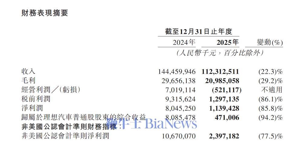 ▲理想汽车2025年财务数据