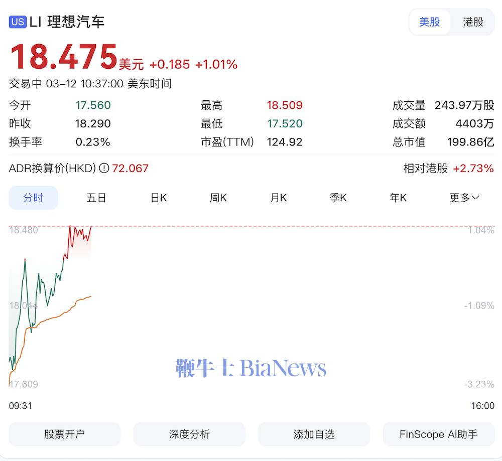截至发文时间,理想汽车美股股价涨1%,报18.475美元/股(约合人民币126.9元/股)。