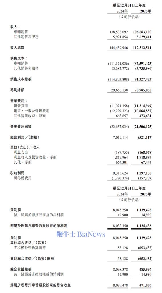 新车方面,全新理想L9系列将在今年第二季度发布,纯电车型方面i6的月交付能力会达到2万台水平,今年下半年推出纯电旗舰SUV理想i9,今年车型搭载的电池将来自理想工厂的自产电池和宁德时代。李想也提到了另外两个辅助策略,即兑现智能化领域的研发成果、发力海外市场,2026年是理想正式布局海外的第一年,海外会有显著的增长和开拓。除了这些,对于业内关心的智驾组织改革、高管出走创业、零部件价格上涨等问题,李想和理想汽车总裁马东辉等管理层也做出了回应。就在今天,理想汽车2025年财报交卷,全年营收1123亿元,这是理想连续三年营收突破千亿,同时理想也连续三年实现盈利,2025年净利润为11亿元,在新势力车企中保持领先。不过,理想汽车2025年营收、净利润、车辆毛利率呈现些许变动,2025年营收同比下滑22.3%,净利润同比下滑85.8%,车辆毛利率从2024年的19.8%下降至2025年的17.9%。在这种情况下,理想汽车完成了从汽车企业向具身智能企业的全面重构,过去一年的研发投入达到113亿元,平均每月投入近10亿元,创历史新高,其中AI相关投入占比50%。截至2025年底,理想汽车现金储备达到1012亿元,保持强劲,为理想汽车的服务网络建设、全球化布局、AI转型提供了殷实家底。