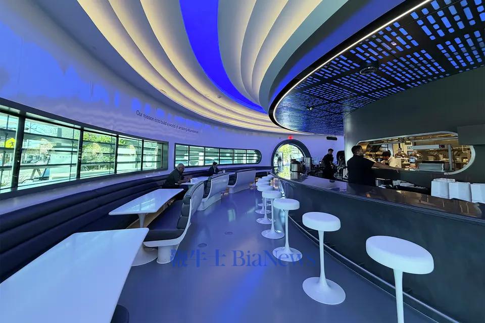 但店内只零星坐着几位食客,或坐在弧形长吧台,或身处灰白配色的复古未来主义卡座里,品尝着炸鸡三明治等美式简餐。