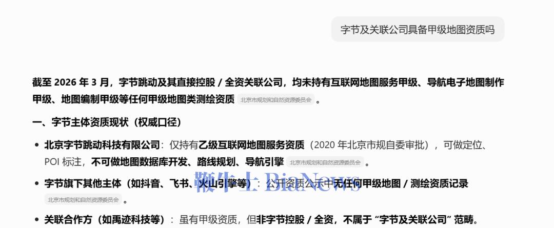 同时,《读佳》注意到:在“轻导航”之外,抖音APP商户页面的导航仅有一项“高德地图(推荐)”,可见二者合作较为深入。《读佳》推测,“轻导航”的研发、运营存在几种可能性:1、该产品为高德地图提供,是二者合作深化的一个表现;2、该产品为抖音或关联公司自研、自运营,那么将不排除其未来以此为基础,加码出行服务;如加码出行服务,令其与其他本地生活服务联动,也有利于生态构建。不过,据豆包AI回复信息,当前字节及关联公司仅具备乙级互联网地图服务资质。以上三种情况,仅为读佳基于客观信息推测的可能性,不代表抖音、高德及其他相关方的官方信息、态度等。(转载自:读佳)