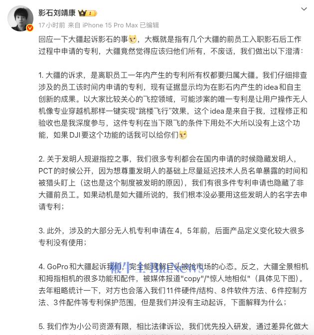 影石创始人刘靖康的回应迅速又强硬。他以一封公开信将战场拉回舆论场,否认专利权属指控,称创意源于自身,并反指大疆产品涉及其28项专利。这位90后掌门人更是直接把这次事件置于行业竞争的大背景下,直言“完全能理解巨头被抢市场的心态”。在其“小公司选择创新而非诉讼”的叙事下,毫不退让。