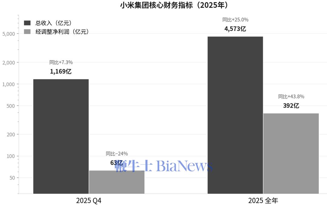 3月24日,小米公布了2025年Q4及全年财报。单看全年数据,挑不出毛病:总收入4573亿元,同比增长25%;经调整净利润392亿元,同比增加43.8%。最受关注的汽车业务(小米智能电动汽车及AI等创新业务),收入首次突破千亿,且实现了9亿元的全年经营收益。