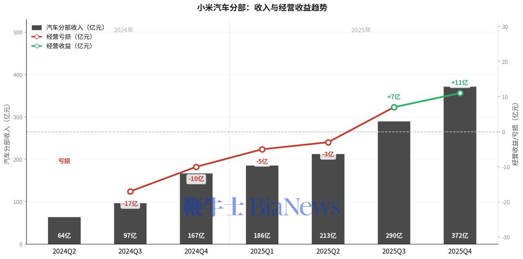 对比2024年高达62亿元的经调整净亏损,2025年全年,小米智能电动汽车及AI等创新业务(以下简称“汽车及创新业务”)首次实现全年经营收益转正,录得9亿元。