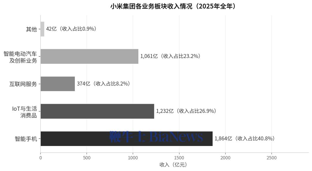 但从利润结构看,各业务的赚钱能力差异悬殊——手机盘子最大,但赚钱效率最低;IoT和互联网服务体量不如手机,却共同贡献了集团超过一半的毛利。汽车当然重要,它改变了市场看小米的方式,但还谈不上改变利润结构。