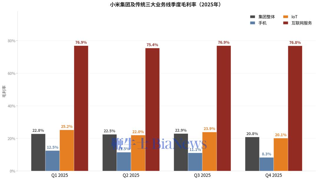 在汽车业务高歌猛进的2025年,作为小米基本盘的手机业务,保住了出货量和均价,赚钱却越来越难,成了小米唯一一个毛利同比下降的业务。