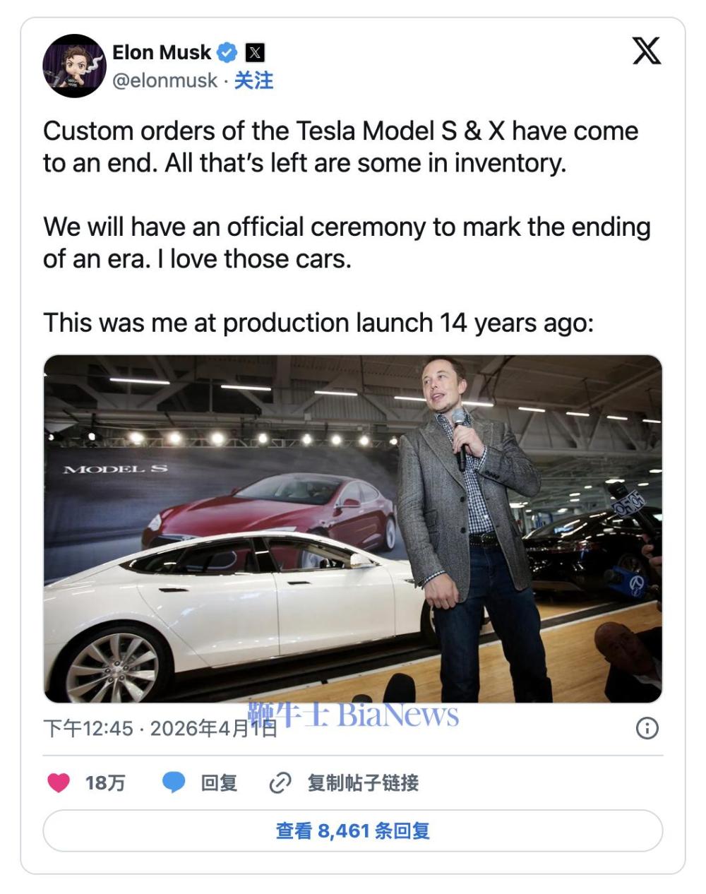 在推文中,马斯克还顺便附上了一张2012年Model S量产发布会的老照片,突显了这一决定的情感分量。