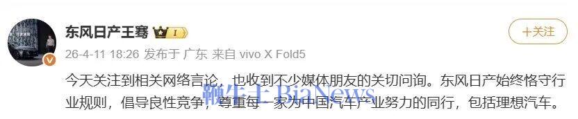 面对这几乎是直接点名的“开火”,东风日产新能源总经理王骞很快回应称,公司始终恪守行业规则,倡导良性竞争,尊重每一家为中国汽车产业努力的同行……