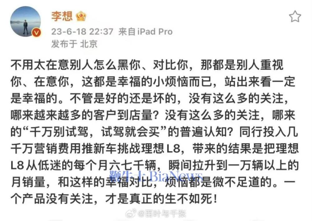 4月11日,理想汽车CEO李想在朋友圈抛出这句火药味十足的话,打响了一场从朋友圈烧到社媒平台的新车口水战。