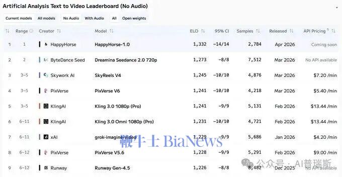 此前,HappyHorse-1.0一经发布便超越了包括字节跳动的Seedance、快手的可灵(Kling)等同类产品,登顶文本转视频和图像转视频(无音频)类榜首,并在文本和图像转视频(带音频)类别中位居第二。(转载自AI普瑞斯)