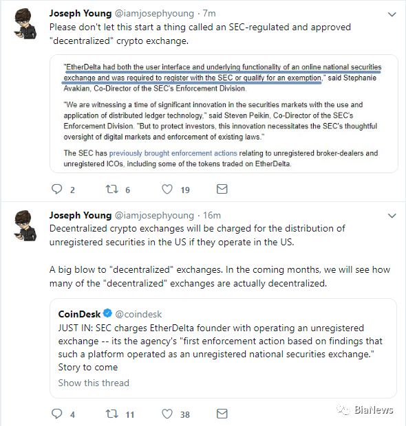 随后,加密货币分析师Joseph Young发布推特表示,美国SEC指控EtherDelta将是对去中心化交易所的一个打击。