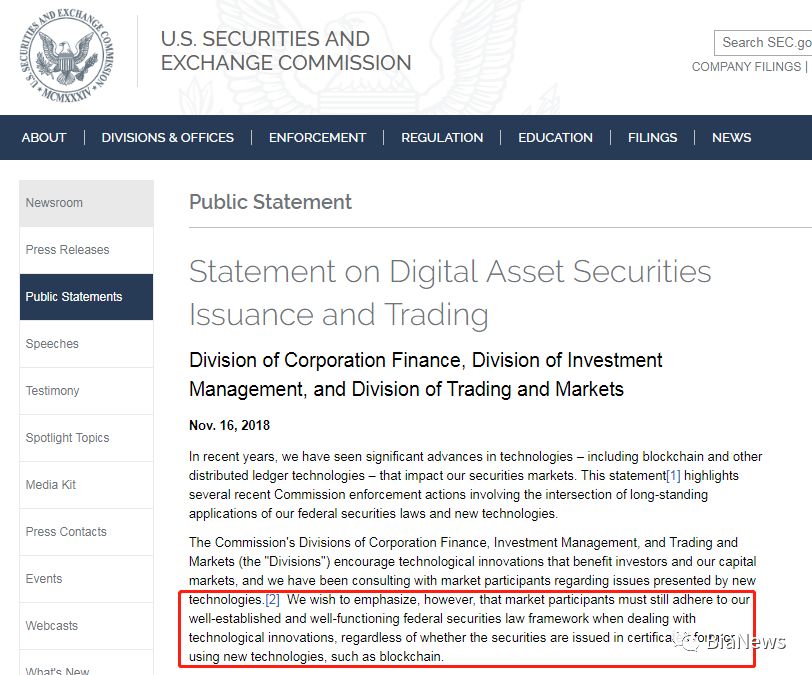 声明中谈到,“无论证券是以认证形式发行还是使用区块链等新技术,市场参与者仍必须遵守我们完善和运行良好的联邦证券法框架”。