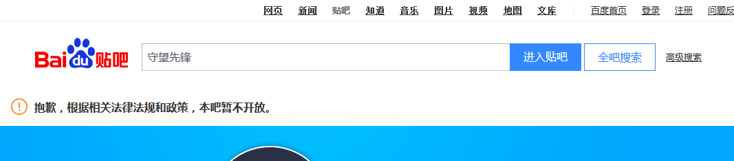 目前,在百度上搜索“守望先锋吧”,会提示“抱歉,根据相关法律法规和政策,本吧暂不开放。”