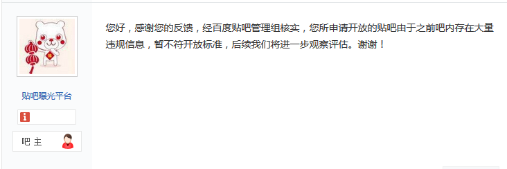 在“贴吧曝光台吧”,有人申请恢复《守望先锋》吧,百度官方给出的答复为:“经百度贴吧管理组核实,您所申请开放的贴吧由于之前吧内存在大量违规信息,暂不符开放标准,后续我们将进一步观察评估。谢谢!”
