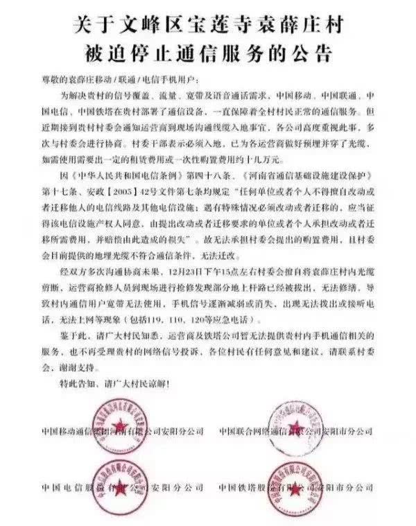 据公告内容显示,为解决位于河南省安阳市文峰区宝莲寺袁薛村的信号覆盖、流量、宽带及语音通话需求,中国移动、中国联通、中国电信以及中国铁塔公司为其部署了通信设备,一直保障该村正常的通信服务。