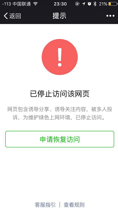 8月18日消息,微信今日晚间突然封杀ofo二维码链接。目前,在微信端扫描ofo小黄车上的二维码,会提示该网页因诱导分享、关注,已被停止访问。