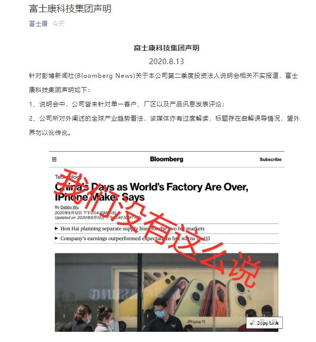 针对彭博新闻社(Bloomberg News)关于本公司第二季度投资法人说明会相关不实报道,富士康科技集团声明如下: