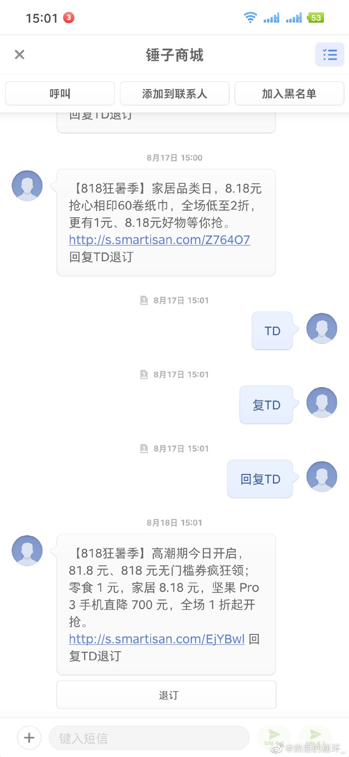 该网友接连多天在下午三点左右会收到锤子商城向自己发送的促销短信,虽然短信最后标有 “回复 TD 退订”,但网友无论回复 “TD”“复 TD”还是 “回复 TD”等内容均无效,第二天短信依然会发送到该用户手机中。