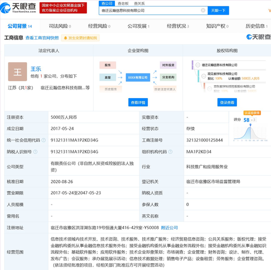 鞭牛士 8月28日消息,天眼查App显示,近日,宿迁云瀚信息科技有限公司发生工商变更,原法定代表人张雱退出,由王乐接任。