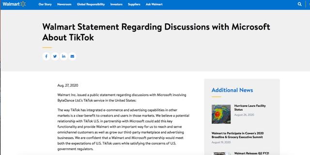 鞭牛士 8月28日消息,昨日晚间,沃尔玛证实,美国零售业巨头沃尔玛正在与微软合作,该公司正与微软联手竞购TikTok。沃尔玛向媒体表示,对收购TikTok感兴趣。